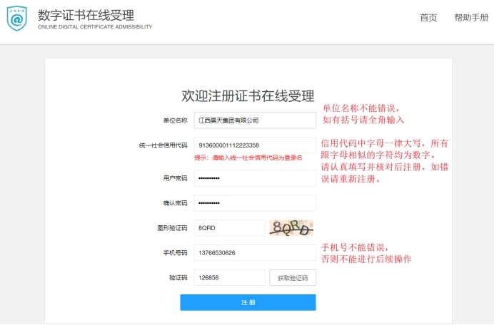 在浏览器中输入地址https://111.75.198.237:8882/,进入“数字证书在线受理系统”,点击免费注册,填写单位名称、统一社会信用代码、手机号等信息完成注册。