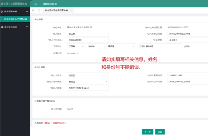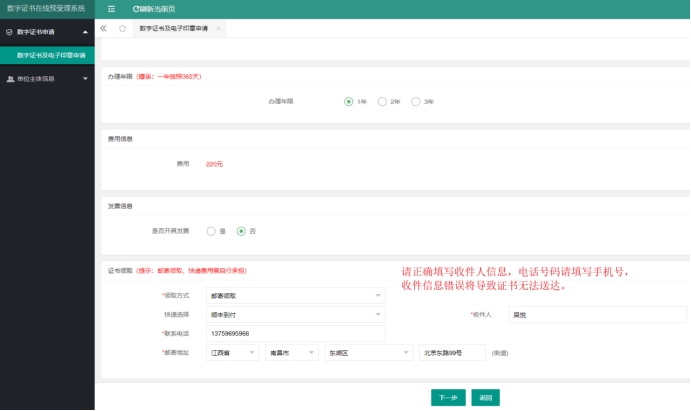 根据单位具体情况填写单位信息、法人信息、经办人信息、发票信息、证书接收人信息等相关信息,以上信息均要求真实有效。收件人信息可修改,收件人电话请填写手机号。所有信息请核对无误后再点下一步。
